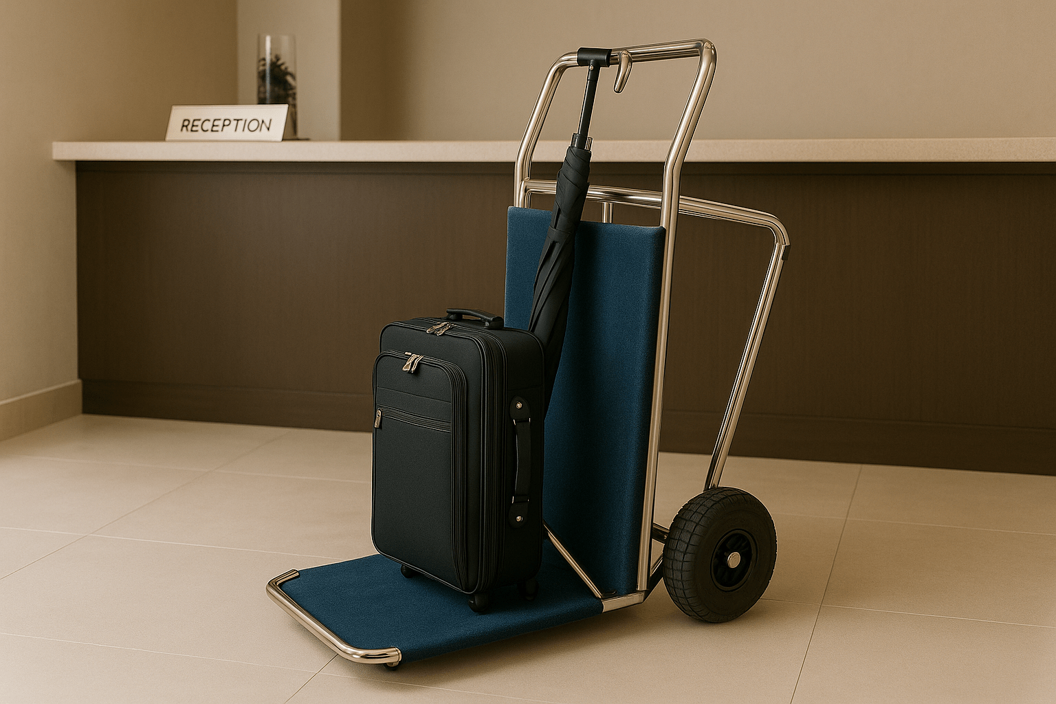 Un carro portaequipajes funcional y elegante, diseñado para ofrecer un servicio eficiente en recepciones y zonas de conserjería.