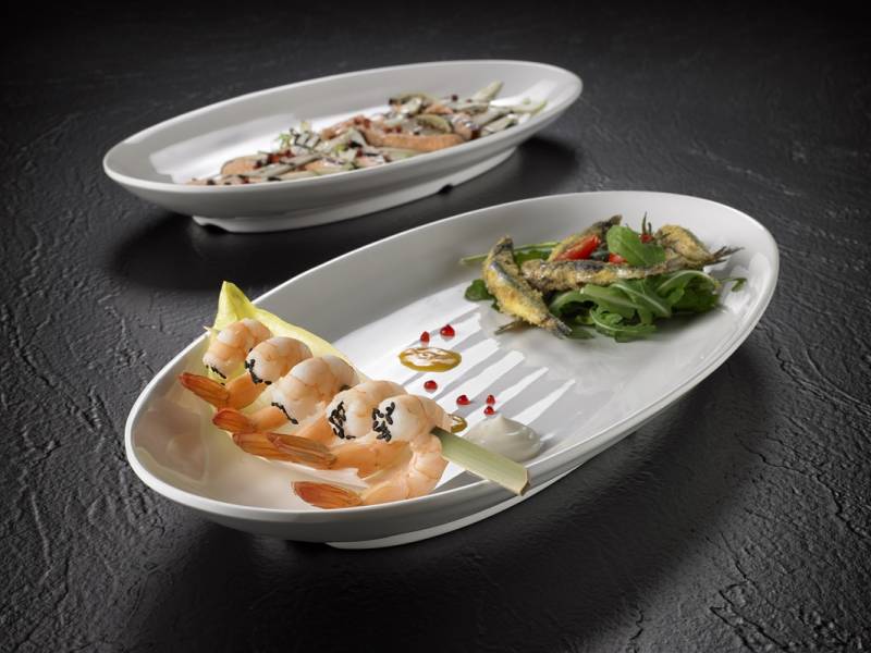 Bandeja ovalada de melamina blanca.Resientes a golpes,caidas y roturas.La melamina es ligera.Ideal para uso diario,terrazas y eventos.