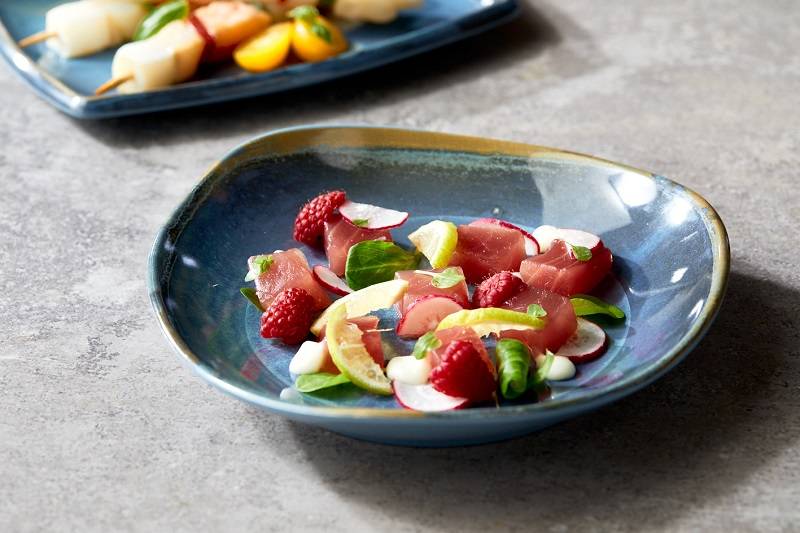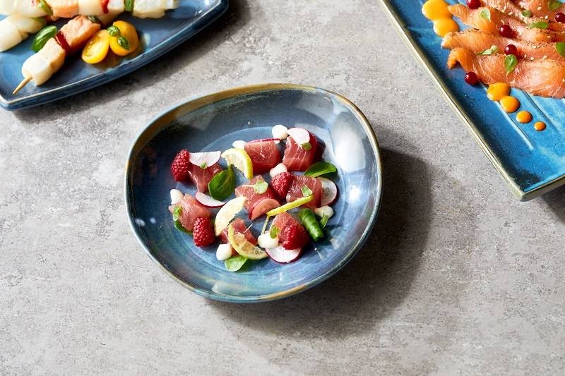 Plato en melamina decorado en azul. Resientes a golpes,caidas y roturas.La melamina es ligera.Ideal para uso diario,terrazas y eventos.